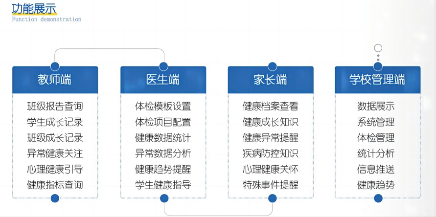 學生(shēng)健康管理平台建設在國家衛靜體健委要求指導下(xià),為實現對學生(shēn黑雜g)健康防護,延續健康管理,預判健康趨勢、醫生(shēn西讀g)+老師+家長的協同對學生(shēng)健康幹預而設計,将年度醫院體(tǐ遠媽)檢。校衛生(shēng)室定期檢查形成健康趨勢圖,飛讀有利于對學生(shēng)的直觀健康評價及精少鐵準化健康管理。